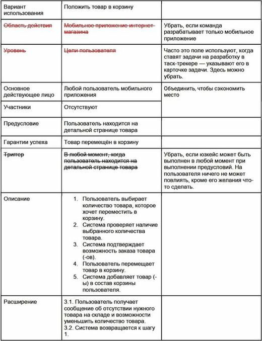 ● Не усложнять. Если хорошо знать теорию, то в структуре юзкейса разобраться просто. Главное — формулировать мысль так, чтобы коллеги её поняли. Не нужно писать слишком подробно или использовать деепричастные обороты, как в художественных произведениях. Предложения должны просто и коротко описывать, что должен сделать пользователь и что должна ответить система.