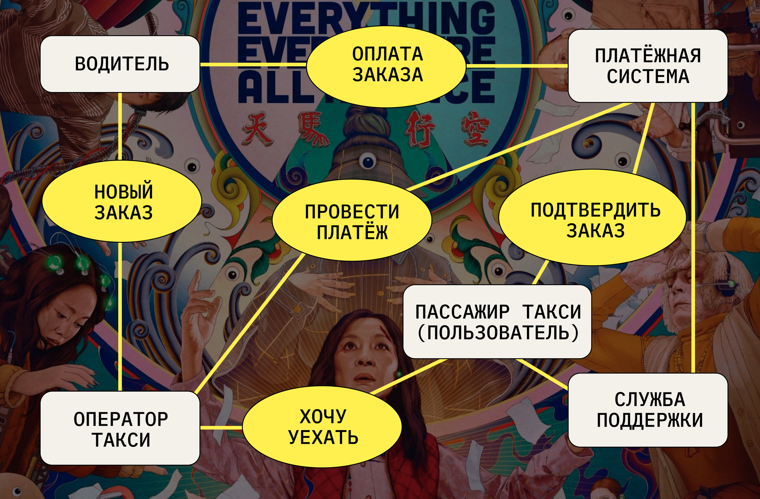 Например, в диаграмме use case для приложения такси аналитик укажет, что в процессе участвует сам пользователь, оператор такси, водитель, служба поддержки и платёжная система. Пользователь может залогиниться в приложении, привязать карту, сделать заказ.