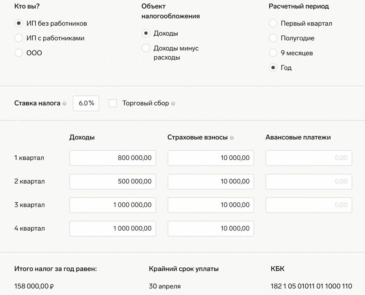 За год ИП заработал 3,3 млн рублей и уплатил 40 тысяч рублей страховых взносов. В таком случае налог за год составит 158 тысяч рублей.