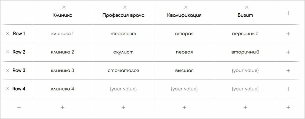 Например, в сервисе записи к врачу пациенты выбирают день, время, специализацию врача и клинику, всего четыре поля. В сервисе зарегистрированы врачи двадцати специализаций от окулиста до дерматолога и три клиники — уникальных комбинаций можно составить сотни.
