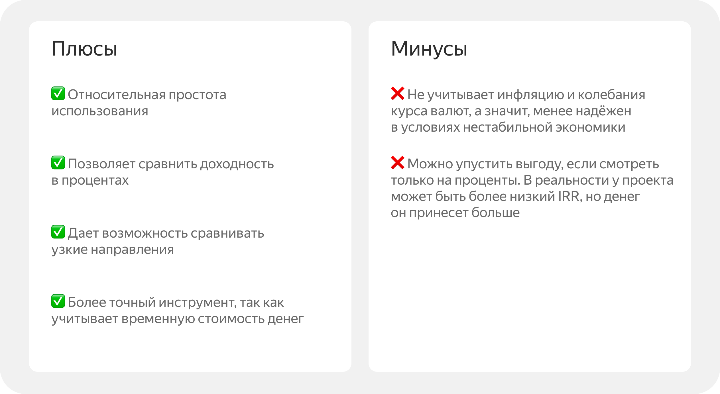 При отрицательном IRR вкладываться в проект не стоит: это приведёт только к невозвратным убыткам.