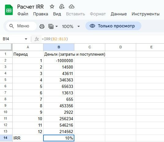 Если IRR равен 0, вложения будут нерентабельны — бизнес ничего не заработает, а только вернёт свои деньги.