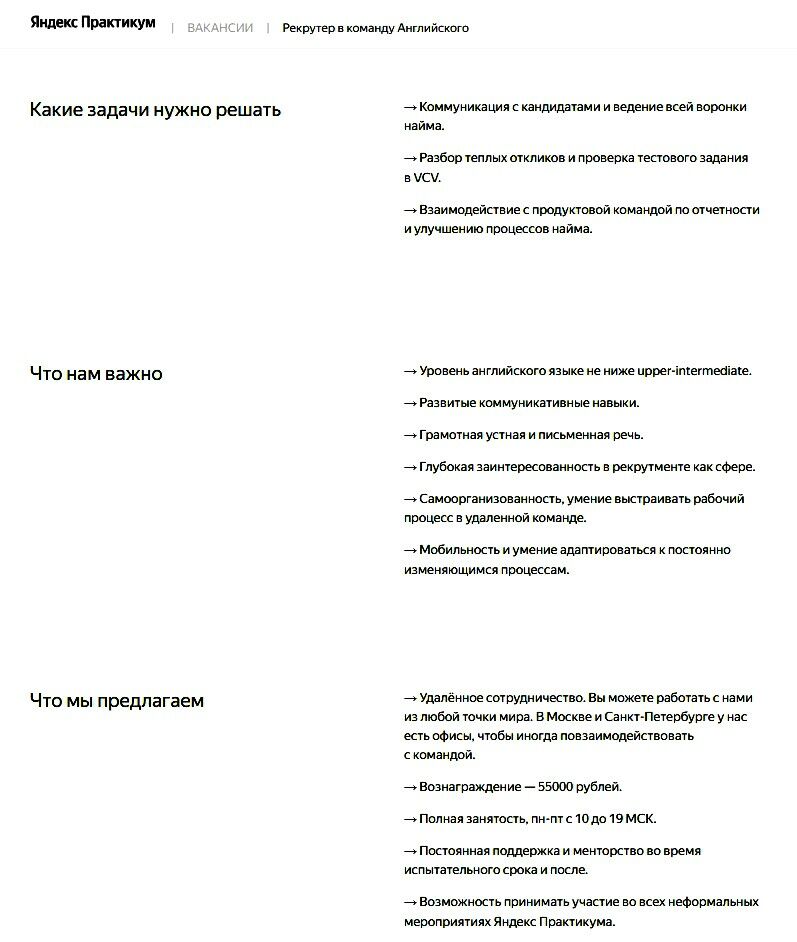 Фрагмент вакансии «Рекрутер в команду английского в Яндекс Практикум». Источник: practicum.yandex