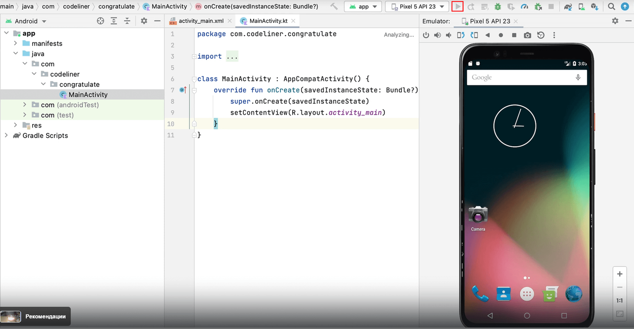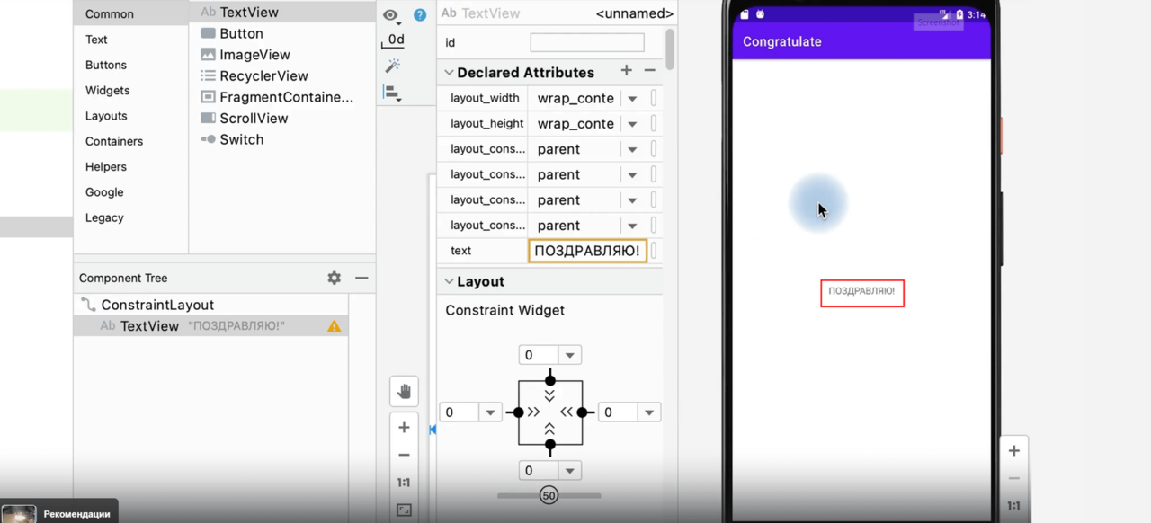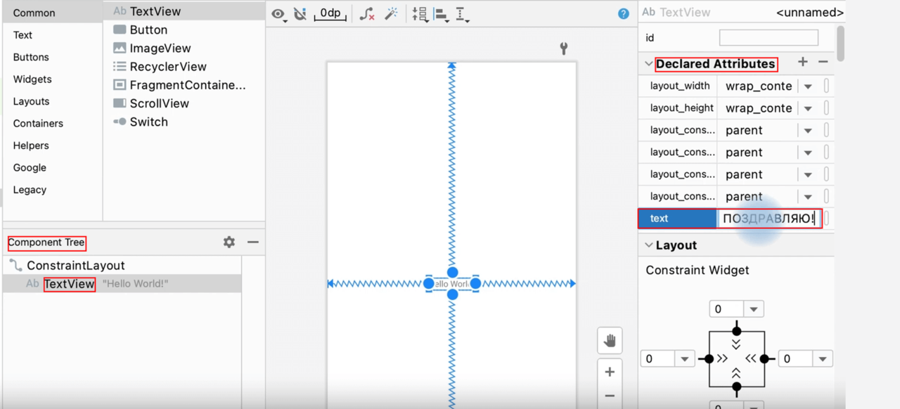 Отредактируйте макет. Для этого зайдите в окно Component Tree и нажмите TextView. В окне Attributes отобразятся компоненты макета. Найдите Declared Attributes и нажмите поле Text. В нём вы можете отредактировать или удалить текстовое приветствие. Например, напишем: «Поздравляю!» Теперь нажмите Enter и снова нажмите Run app, чтобы проверить корректность отображения нового текста.