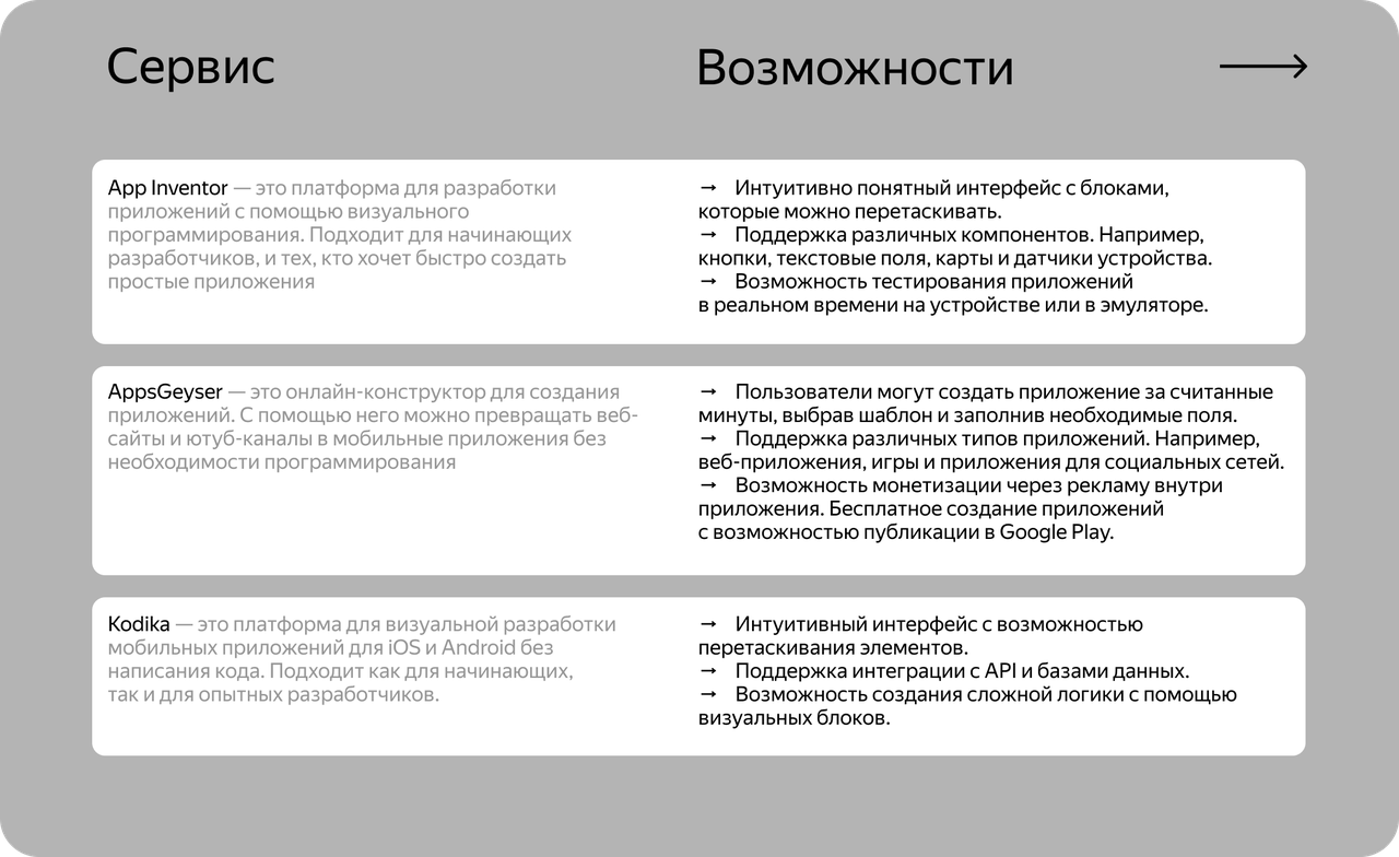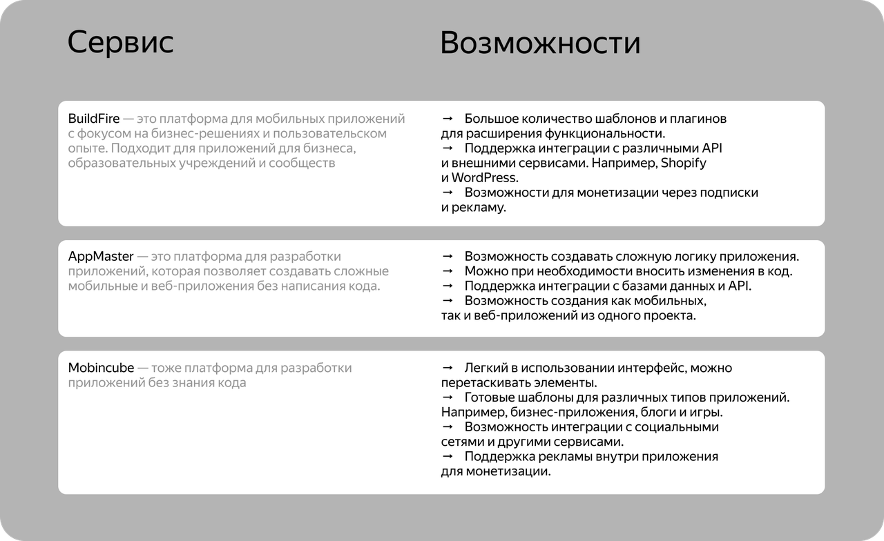 Выбор платформы зависит от целей разработки, уровня опыта и требований к функциональности приложения. Мы собрали девять самых популярных сервисов, которые не требуют знания кода.