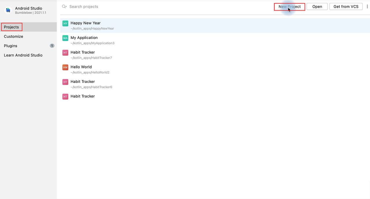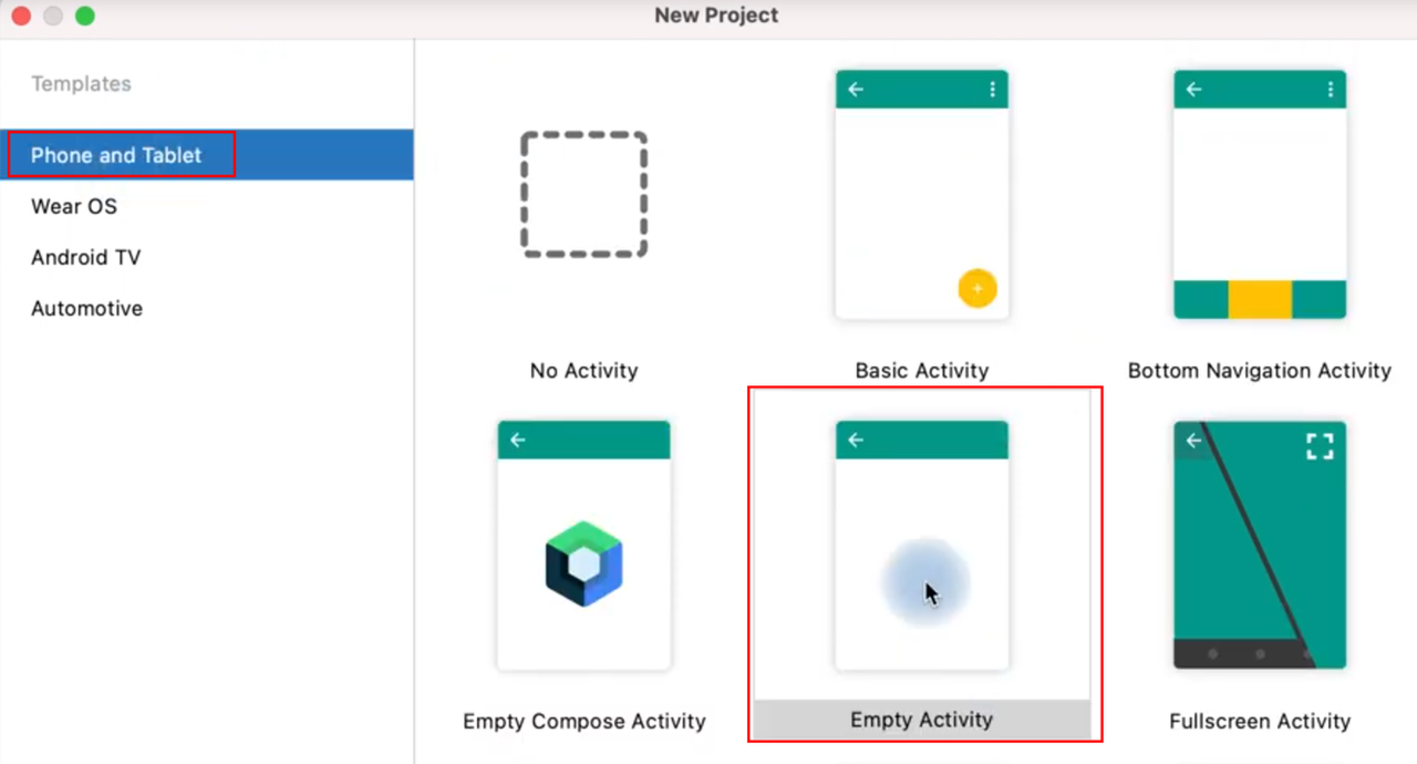 Для примера создадим поздравительное мобильное приложение без применения кода. После установки Android Studio на компьютер запустите программу, нажмите кнопки Project и New Project. Затем нажмите Phone and Tablet и выберите пустой проект — Empty Activity.