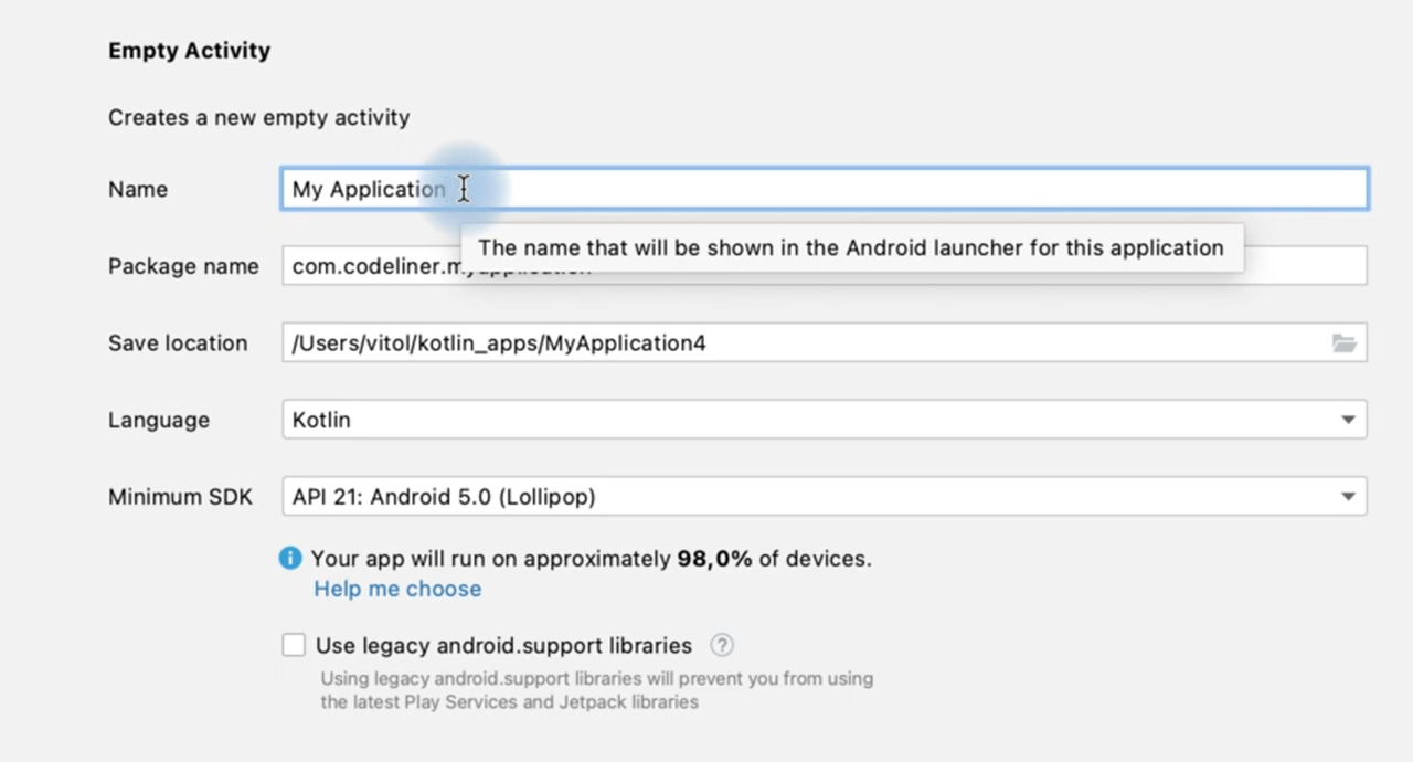 Создайте анкету приложения. Для этого введите в поле название приложения, остальные параметры изменятся автоматически. Затем нажмите Finish. После этого начнётся загрузка структуры проекта — она займёт несколько секунд. После загрузки структура отобразится в левой части меню, а в правой появится содержимое файлов (код).