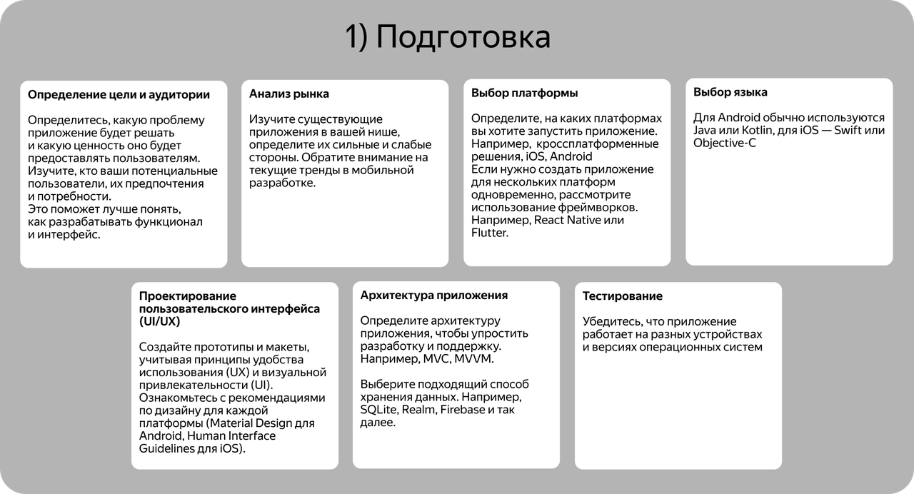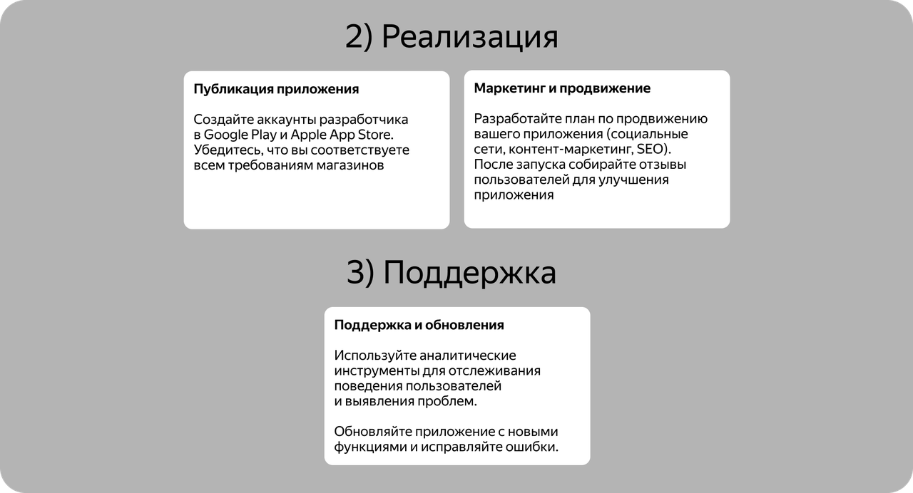 Основные этапы разработки приложения — подготовка, реализация и поддержка. Каждый из этапов содержит подэтапы. Рассказали об этом в таблице.