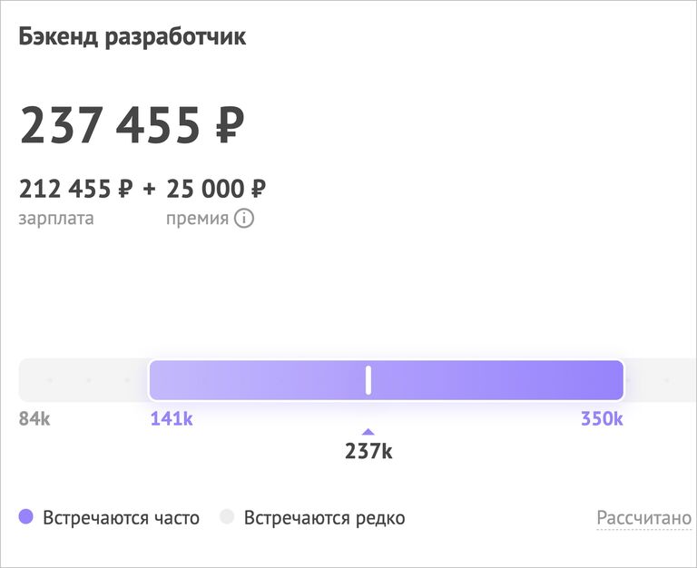 Средняя зарплата backend-разработчика с учётом премии составляет 237 тыс. рублей. Источник