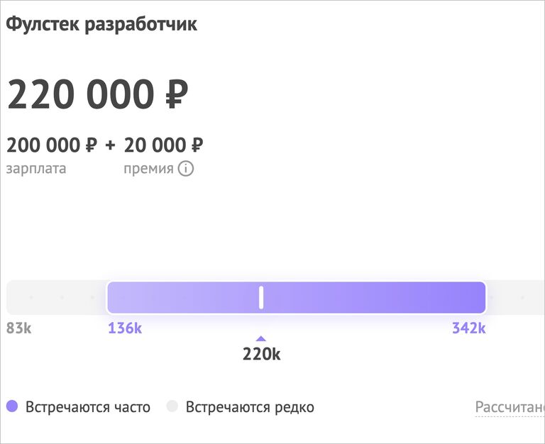 Средняя зарплата фулстек-разработчика составляет 220 тыс. рублей с учётом премии. Источник