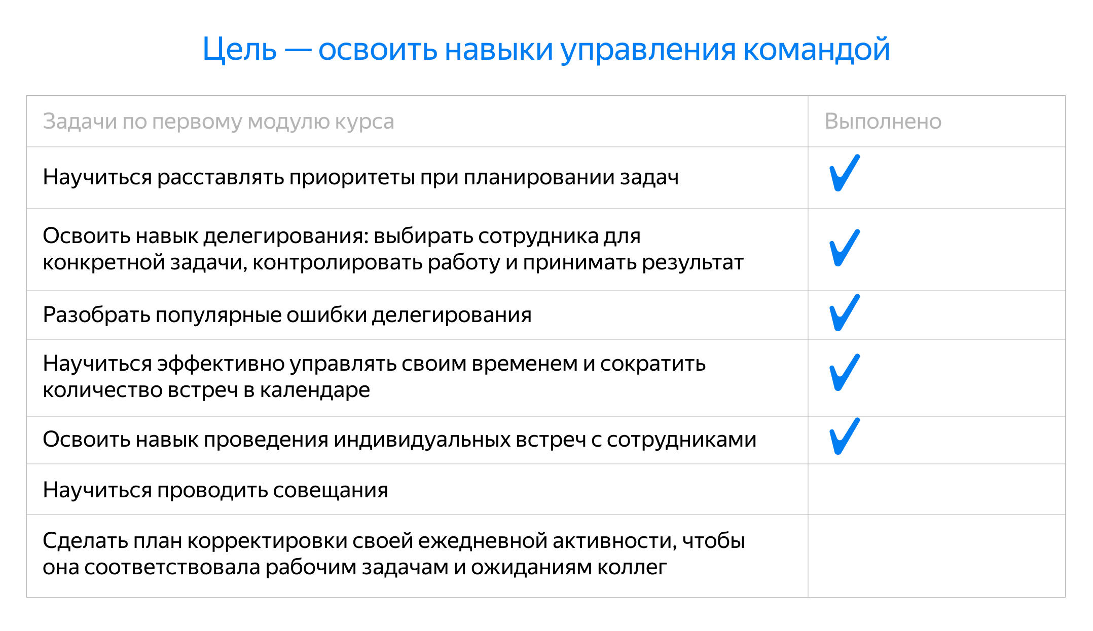 Начинающий начальник отдела записался на курс «Управление командой», чтобы освоить навыки эффективного руководителя. Для этого нужно пройти 5 модулей курса. Так может выглядеть чек-лист по первому модулю. Задача решена, когда он отработал навык в своей компании, на практическом задании или воркшопе