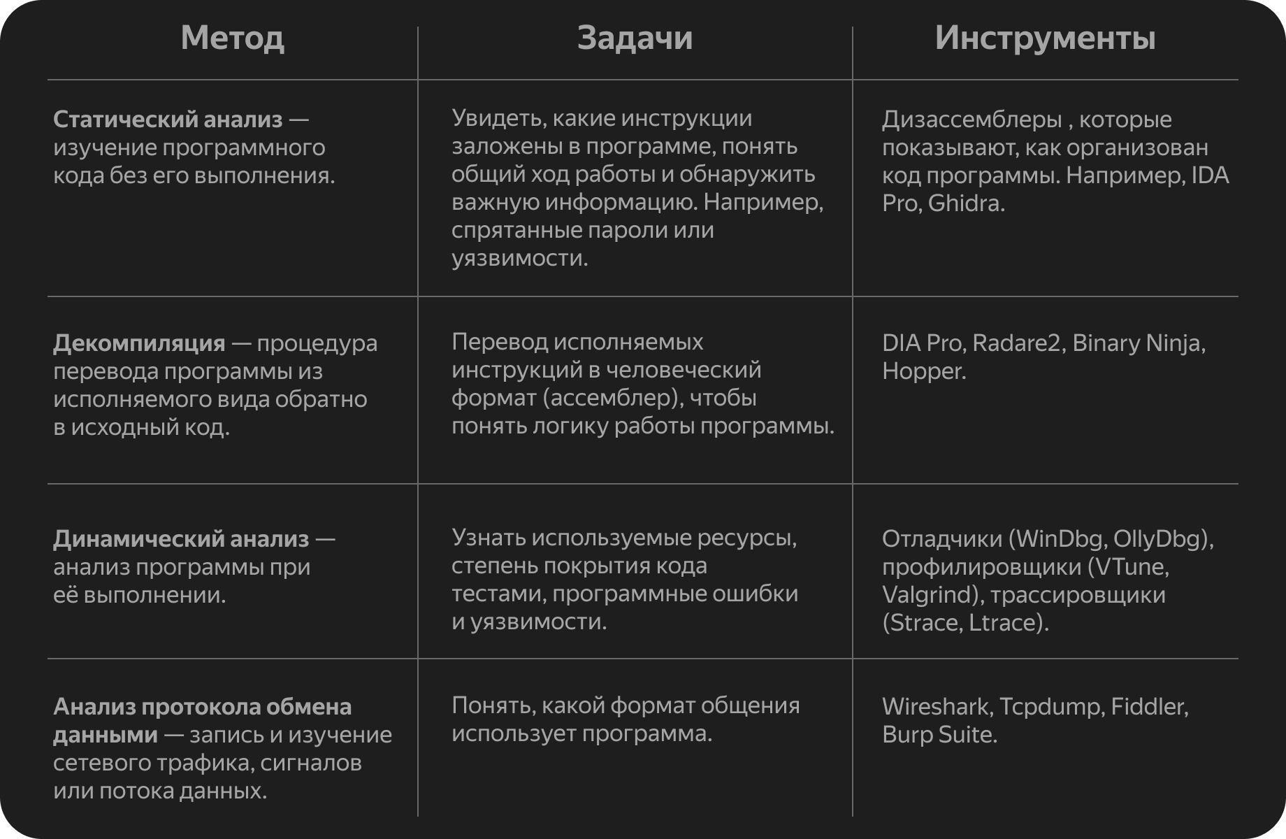 Выбор метода и инструментов обратной разработки зависит от целей исследований. Например, чтобы узнать инструкции программы, подходят статистический, динамический и другие методы исследования. Расскажем подробнее об этом.