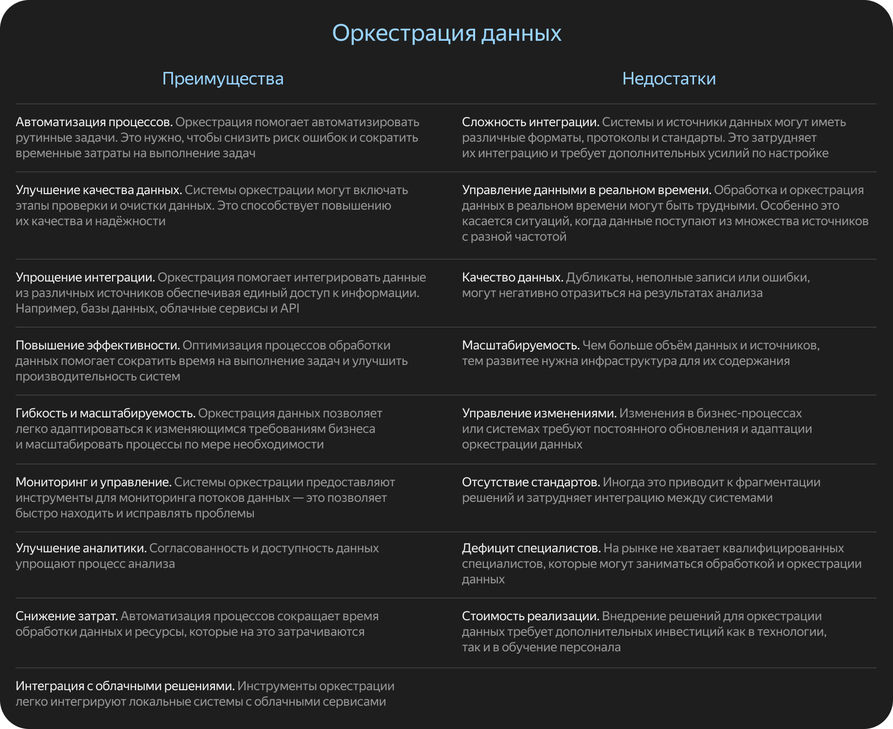 Преимущества оркестровки включают автоматизацию задач, связанных с обработкой, трансформацией и передачей данных. Недостатки — масштабируемость и трудности в управлении. Расскажем об этом подробнее в таблице.