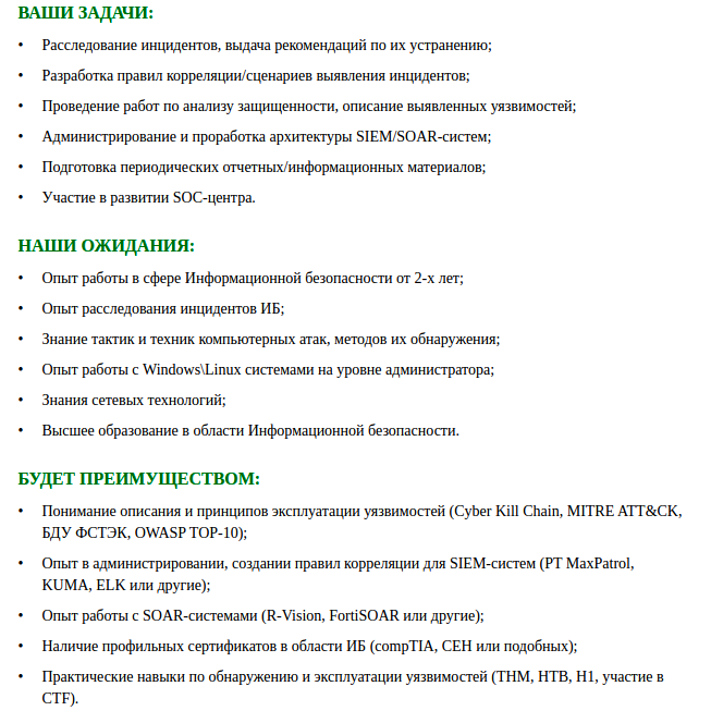 Пример требований к SOC-аналитику в России