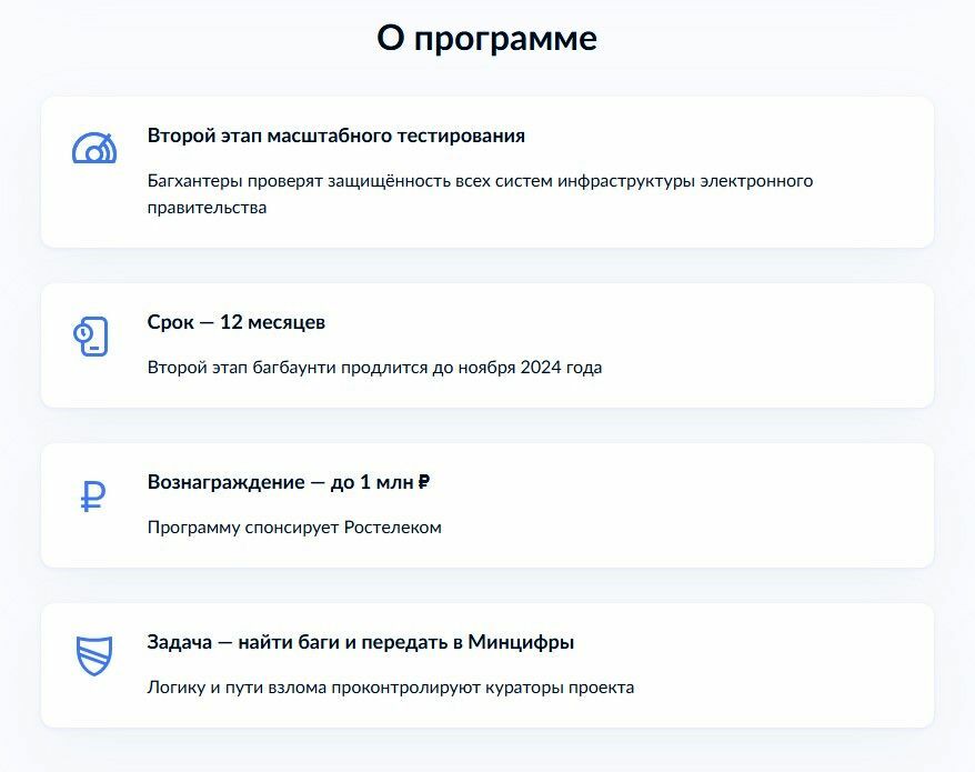 Как правило, сумма вознаграждения зависит от критичности найденной уязвимости. В программе Bug Bounty Минцифры низкие оцениваются до 30 тыс. рублей, высокие — до 300 тыс. рублей, критические — до 1 млн рублей. Источник: gosuslugi