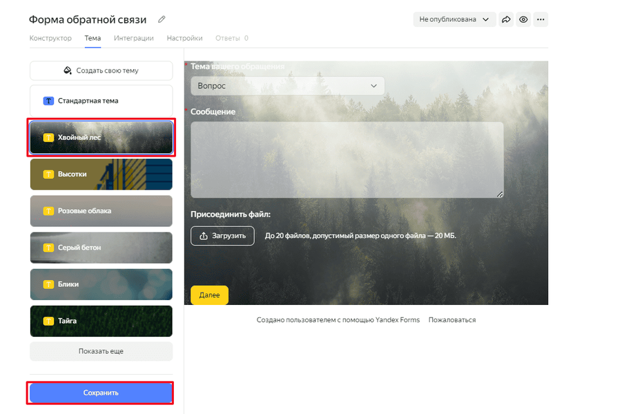 Сайт откроет окно формы. С левой стороны находится панель параметров. В ней размещены инструменты для редактуры текста, форматов цифр и ввода, выбора, прикрепления ссылок, почты, телефона и т. д. Вверху находится выбор тем, интеграции, настроек, ответов, предпросмотра и кнопка публикации. Начнём с выбора темы для опроса. Нажмите кнопку «Темы», в левом меню выберите подходящий фон → «Сохранить».