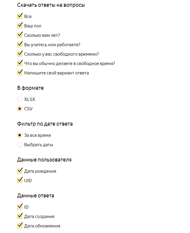 Статистика по формам показана в виде таблицы с вопросами и вариантами ответов. Ответы отображаются в процентном соотношении. Это сделано для удобства анализа. С левой стороны размещена панель параметров для скачивания результатов опроса. С её помощью можно отредактировать данные — например, выгрузить только информацию по определённым ответам или по дате ответа. Скачать отчёт можно в формате XLSX или CSV.
