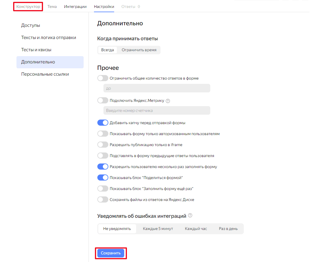 Теперь нажмите кнопку «Настройки» → «Дополнительно». Здесь можно ограничить время, добавить капчу, разрешить пользователю заполнять форму несколько раз, также предусмотрены другие функции. Для примера установим разрешение на капчу, многократное заполнение формы и возможность делиться ею. После настроек вернитесь в конструктор.