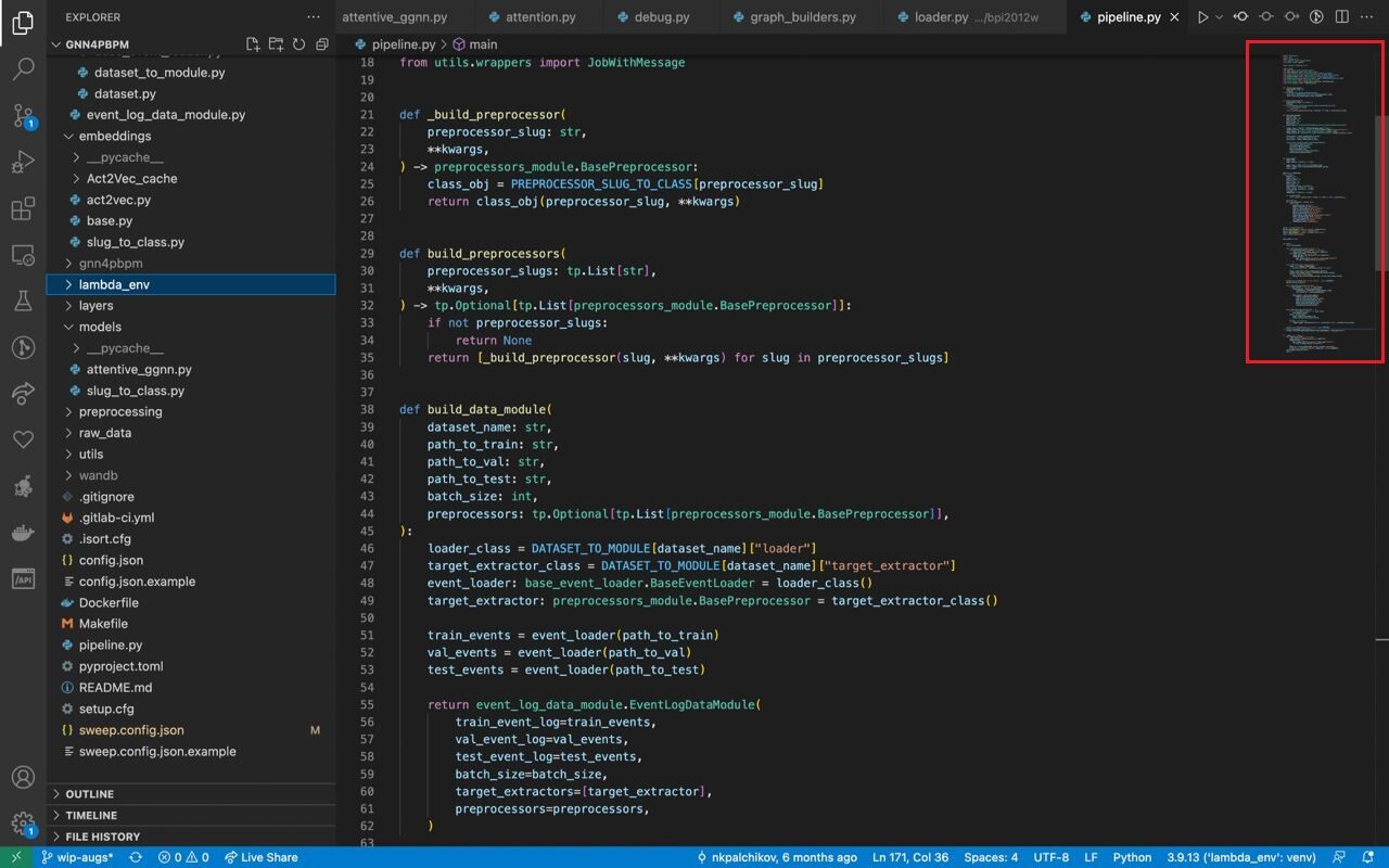 В самой правой части находится небольшое окошко, в котором отображается весь код в уменьшенном варианте, чтобы можно было быстро перейти в нужное место кода.